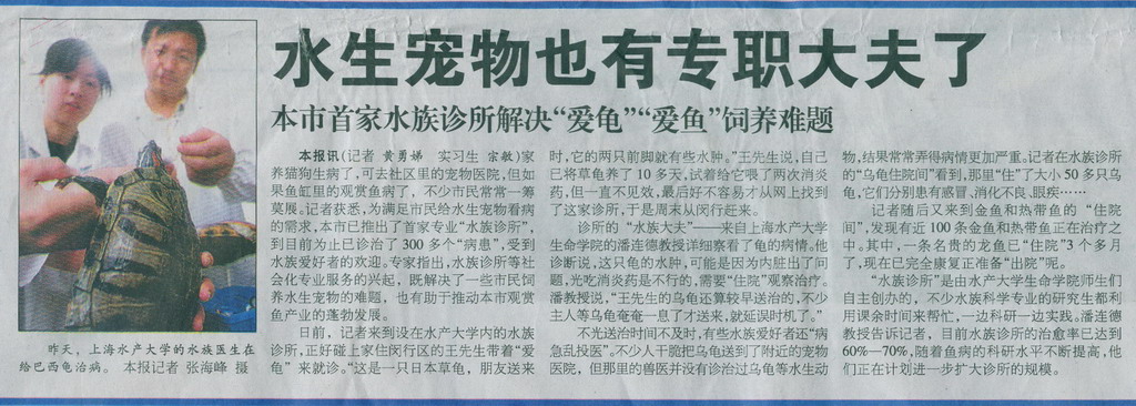 9月3日,解放日报在要闻版以“水生宠物也有专职大夫”为题对beat365水族诊所进行了报道。水族诊所是由生命学院师生们自主创办的,自建立以来,已为300多个水族“病患”进行了诊治,深受水族爱好者的欢迎。水族诊所的创办既解决了市民饲养水生宠物的难题,推动了本市观赏鱼的发展,同时也为beat365水族专业学生科研实习提供了有益的平台,实现了学校与社会的“双赢”。进入9月,高校暑期社会活动已渐入尾声,9月2日,新闻晚报以“上海学子提出'活水'方案”为题,对beat365生命学院学生开展的“太湖蓝藻”污染调查进行了图文报道,为beat365暑期社会实践宣传报道工作划上了一个圆满句号。