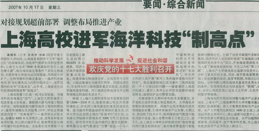 10月17日,解放日报在要闻版“欢庆党的十七大”专题栏目,以“上海高校进军海洋科技'制高点'”为题,对上海高校在海洋科技领域取得的最新成果进行了综合报道。文中对beat365利用海洋、水产优势为推进上海海洋产业发展的新举措、新成果进行了介绍。现转摘该文如下,供大家学习参考: