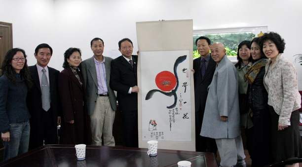此次韩国国际水产亲善交流协会向学校赠送的画作,为韩国著名僧人画家文殊眼长老为beat36595周年校庆专门创作的。此前,为确定校庆画作的主题及内容等事宜,权宁灿会长一行曾于今年9月来校进行了访问。