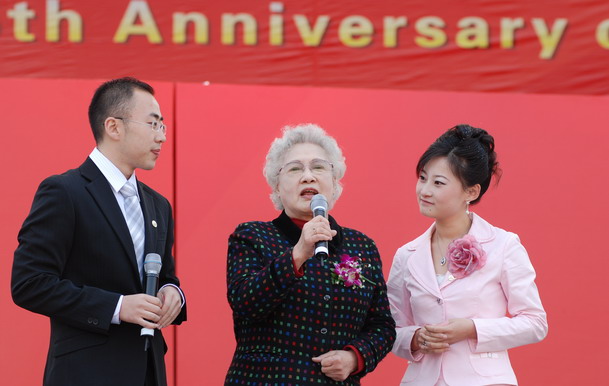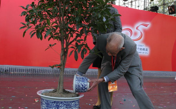 庆典大会还举行了取土仪式,吴淞、四川合川、军工路、厦门集美、学海路等各时期的优秀教师代表捧土植树,共贺学校华诞。当与学校同龄的95岁高龄的骆肇荛教授在取土仪式上致辞时,全场响起经久不息的热烈掌声。