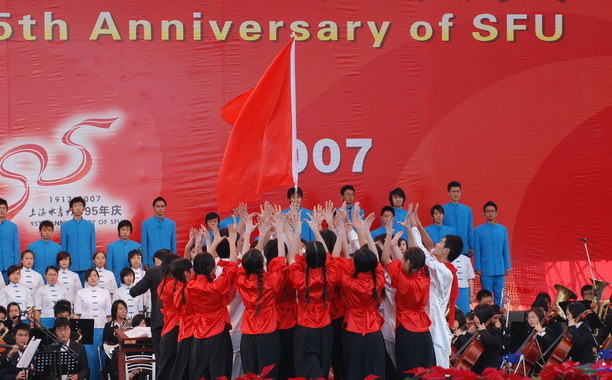 上午10时整,校党委书记叶骏宣布庆典大会正式开始。在象征学校走过95周年历程的95声大型礼花声中,数千只彩球一齐放飞,迎风飘扬。伴随着庄严的国歌音乐,国旗冉冉升起。会场全体起立,齐唱国歌,拉开了校庆庆典的帷幕。