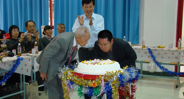 茶话会上,身着礼服的骆老精神矍铄,笑容满面,对与会人员的祝福表示感谢,并勉励大家爱岗敬业、严谨笃学、淡泊名利、志存高远。骆老还向食品学院赠送了“发扬九五传统学科优势、培育食品现代科技人才” 题词。随后,在《生日快乐》的歌声中,骆老同亲友们一起吹灭生日蜡烛,并亲自切开生日蛋糕……