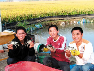其中的奥秘在哪里呢?王武教授分析说,给河蟹吃了强化营养饲料后,蟹的粪便就富含氮、磷、钾,正好起到给水稻施肥的作用,而且这种绿色的“有机肥料”比化肥的效果更好。河蟹在稻田中生长,还会“负责”除草、除虫、松土等工作。此外,采用“大垄双行”技术,能使每穴水稻都有边际效应,提高产量。