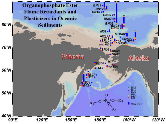 近年来,具有持久性、毒性、生物蓄积性及长距离迁移能力的持久性有机污染物(POPs)全球循环问题已经升级为全球性环境问题,北极地区已不再是远离人类污染的净土,继溴代阻燃剂多溴联苯醚(PBDEs)加入《斯德哥尔摩公约》POPs黑名单后,磷系阻燃剂(OPEs)作为其替代品目前被大量生产和使用,但其潜在环境效应仍不清楚。该研究依托中国极地科学考察船“雪龙号”采样平台获得的北太平洋至北冰洋海域的沉积物样品,分析了OPEs的含量、组成和分布,探讨了其远距离传输潜力,并核算了其沉积通量。首次发现OPEs在北冰洋中心区沉积物中含量最高,甚至高于它所取代的PBDEs含量。OPEs由于自身的半衰期很短、阳光下容易降解而未被列为经典POPs,但它们还是被传输到偏远的北极沉积物中。该研究成果对斯德哥尔摩公约对化学品长距离传输的评估方式是否应改变并考虑其他传输方式提出了新的问题。