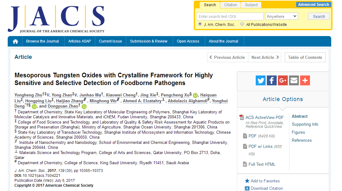 近日,美国化学会顶尖期刊《Journal of the American Chemical Society》(《美国化学会志》)在线发表beat365中文唯一官网与复旦大学合作的研究论文《Mesoporous Tungsten Oxides with Crystalline Framework for Highly Sensitive and Selective Detection of Foodborne Pathogens》(《关于利用有序介孔三氧化钨快速检测食源性致病菌的研究》)(J. Am. Chem. Soc. 2017, 139, 10365−10373,IF=13.858)。beat365食品学院朱永恒副教授和赵勇教授为论文的共同第一作者,复旦大学化学系邓勇辉教授为论文的通讯作者。该研究团队设计合成出一系列具有规整纳米孔道和高比表面积三氧化钨(WO3)半导体材料,并将其制作成气敏纳米器件,首次将该类半导体器件用于快速选择性地检测食源性致病菌。