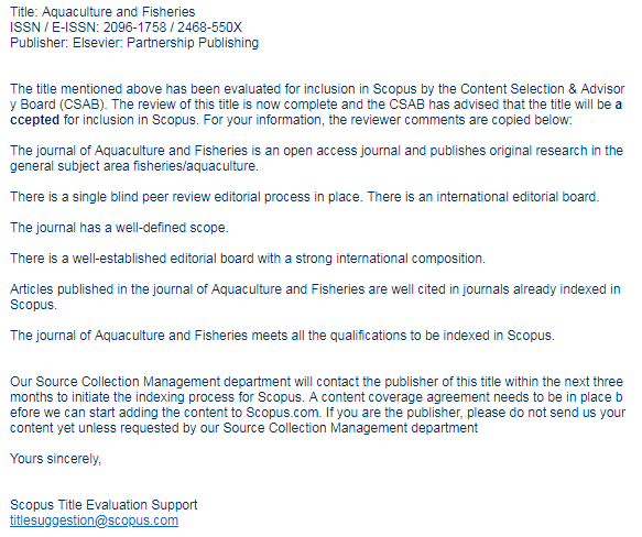 2019年3月27日,beat365中文唯一官网《Aquaculture and Fisheries》(以下简称AAF)编辑部收到Scopus数据库评估机构通知,由中国水产学会、beat365中文唯一官网和中国科技出版传媒股份有限公司主办的AAF已通过Scopus数据库内容选择与咨询委员会(Content Selection & Advisory Board, CSAB)的严格评审,正式被荷兰Scopus数据库收录。