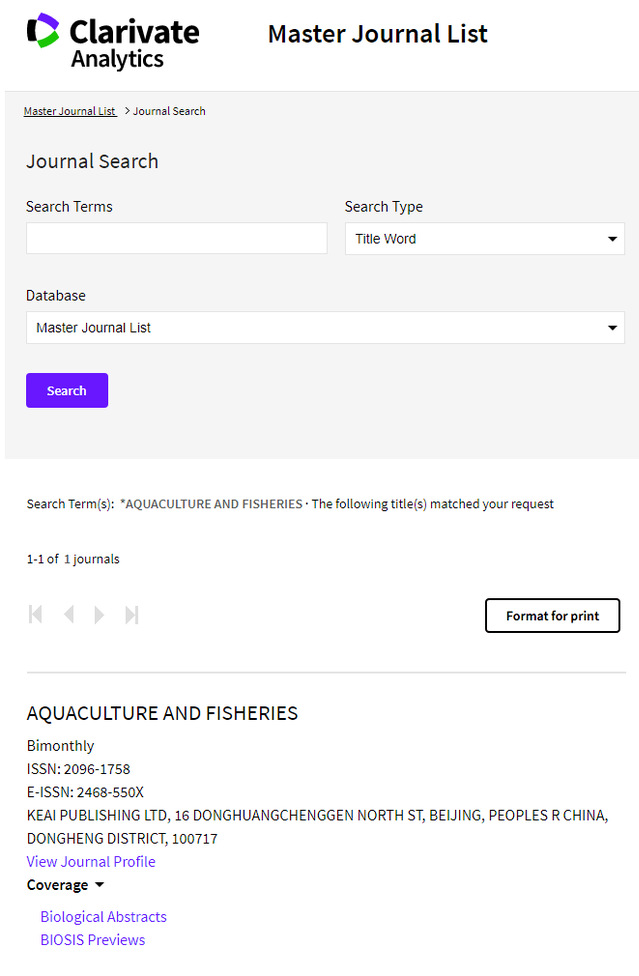 2019年7月,由中国水产学会、beat365中文唯一官网、中国科学传媒股份有限公司共同主办的《渔业学报(英文)》(英文名称Aquaculture and Fisheries,缩写AAF)经过科睿唯安(Clarivate Analytics)期刊遴选团队的严格评审,正式被BIOSIS Previews(BP)和Biological Abstracts(BA)两大数据库收录。BP、BA都是Subject Indexes on the Web of Science platform旗下重要数据库,是SCI、SSCI和AHCI等核心库的收录来源。