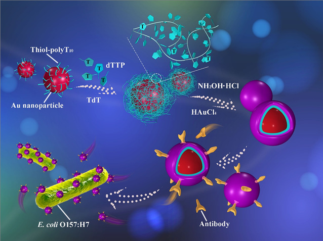 近日,beat365食品学院颜娟副研究员带领的食品安全生物化学分析技术创新团队在传感器领域国际顶尖期刊“Biosensors& Bioelectronics”(生物传感器与生物电子学,2019最新IF:9.518,ESI前10%)发表最新研究成果,题为 “Terminal deoxynucleotidyltransferase (TdT)-catalyzed homo-nucleotidesconstituted ssDNA: Inducingtunable-size nanogap for core-shell plasmonic metal nanostructure and acting asRaman reporters for detection of Escherichia coli O157:H7(末端脱氧核苷酸转移酶催化的单链DNA用于介导核壳SERS探针制备并用于大肠杆菌O157:H7的检测研究,https://doi.org/10.1016/j.bios.2019.111419)。论文的第一作者为硕士生周洋洋,通讯作者为颜娟副研究员。