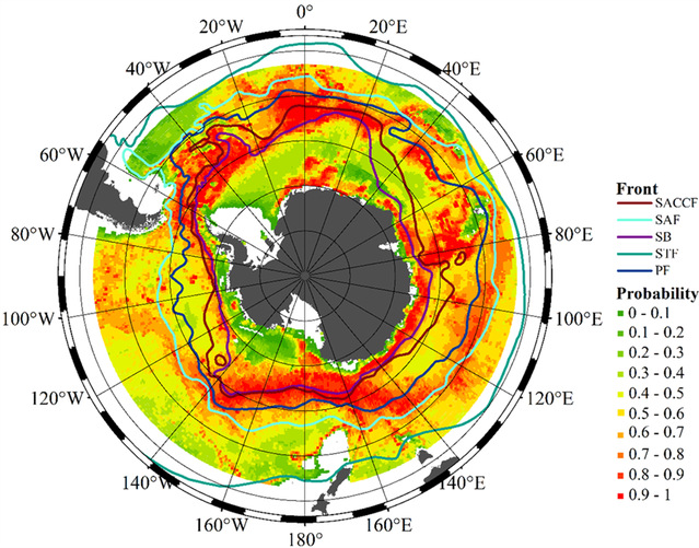 南极电灯鱼为栖息于南极的灯笼鱼科中数量最多、资源量最为丰富且分布最广的鱼种,并具有一定的商业价值。该鱼种因其体表大量的发光器而得名。该鱼种仔鱼分布于斯科舍海、东南极拉扎列夫海以及印度洋和太平洋扇区的高纬度海区,而成鱼则主要分布于西南极斯科舍海南奥克尼群岛及南设得兰群岛等周边海域以及斯科舍海南侧海域,东南极凯尔盖朗海台周边水域也有大量分布;仔鱼及成鱼重叠分布于南乔治亚岛及布韦岛交汇处(图1)。从管控南大洋生态系统结构的主要流系——南极绕极流(Antarctic Circumpolar Current,ACC)角度来看,南极电灯鱼种群分布区域北至亚热带锋(SubTropical Front, STF),南至南极绕极流南锋(Southern ACC Front,SACCF)和南极绕极流南界(Southern Boundary,SB)以南水域,种群结构与南极绕极流锋面存在极为密切的关系。南极电灯鱼在南大洋生态系统中有着极为重要的生态作用,尤其在南大洋生态系统关键物种——南极磷虾(Euphausia superba)资源量分布较少的海区或资源量处于较低水平的年份,南极电灯鱼在生态功能上可替代南极磷虾的关键作用,为南极生态系统中的顶级捕食者,如海豹、企鹅、鲸鱼以及飞鸟等提供能量来源。但相对于南极磷虾而言,南极电灯鱼因其商业价值较低等原因而受到较少的关注,这进一步导致关于该鱼种的种群动力学、生活史过程以及资源量等方面的研究极为有限。