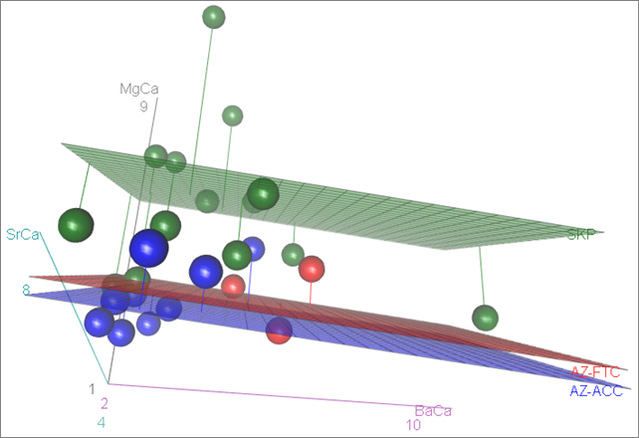 在此基础上,研究团队对东南极凯尔盖朗海台周边水域南极电灯鱼耳石微化学开展研究。在结合物理海洋学、生物海洋学以及鱼类生物学与生态学等学科知识,研究团队分析了南极绕极流主要锋面——南极绕极流南锋、南极绕极流南界、南极陆坡锋以及凯尔盖朗海台本地的小鹿海槽流对南极电灯鱼种群的隔离作用,并进一步探究绕极深层水(Circumpolar Deep Water,CDW)对南极电灯鱼生活史过程产生的影响。研究结果表明,结合南极电灯鱼耳石微化学与采样区域的海洋学环境数据,可以确定不同属性水体的南极电灯鱼耳石微化学特征,耳石微化学特征信息可作为南极电灯鱼种群结构划分的标记。研究结果进一步显示,南极陆坡锋有效地将南极绕极流流域与南极陆坡区域的南极电灯鱼种群隔离开来,而南极绕极流流域与凯尔盖朗海台上的南极电灯鱼种群结构存在较为明显的差异,并由此推断凯尔盖朗海台存在南极电灯鱼自我维持的产卵场和产卵群体。耳石中镁钙元素比值(MgCa-1)为南极电灯鱼种群划分提供了良好的化学标记。研究团队认为,在南极绕极流管控南大洋生态系统的背景下,鱼类耳石微化学技术有助于解析南大洋鱼类种群结构的异质性以及环极连通性,并进一步在阐析南极海洋生物-物理相互作用上发挥作用,有效拓宽了生物海洋学的研究范畴。评审专家对该研究给出了极高的评价,“该研究为影响凯尔盖朗海台南侧水域南极电灯鱼种群结构和连通性的生物-物理参数提供了令人兴奋的探索,为当地海洋学提供了极好的背景知识,也为所设定的假设提供了先进的生物-物理验证”。