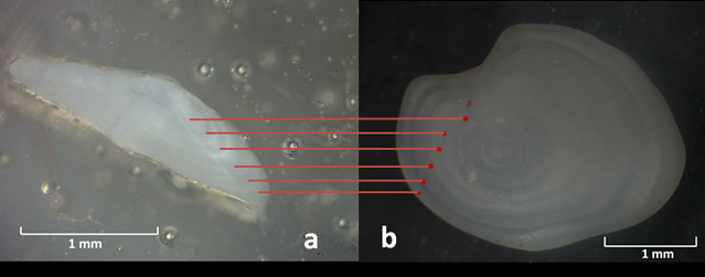 南极电灯鱼耳石截面(a)以及全耳石(b)