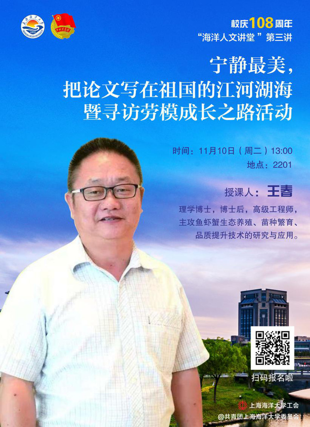 主讲人:王春,男,重庆市人,理学博士,博士后,beat365中文唯一官网水产与生命学院高级工程师,主攻鱼虾蟹生态养殖、苗种繁育、品质提升技术的研究与应用。教育部全国万名优秀创业创新导师库首批入库导师,上海市劳动模范,上海市河蟹产业体系优质蟹种培育组岗位专家,上海市教育系统“精品虾蟹生态养殖劳模创新工作室”主持人,第二批江苏省创业创新引进人才,台湾苗栗县荣誉县民。获上海市科技进步一、二、三等奖各一次,广东省科技进步二等奖一次;发表论文40余篇、授权专利6项、参与著书一本;指导研究生和本科生荣获“挑战杯”和“创青春”全国大学生创业创新大赛金奖和银奖各一次,“挑战杯”和“创青春”上海市大学生创业创新大赛实践赛金奖和铜奖各两次;上海市高校“科创杯”发明创造大赛特等奖;全国高校商业精英赛国际贸易实践赛一等奖一次;全国大学生生物科学创业创新实践赛一等奖一次。水产一线实践近三十年,足迹遍及长三角和珠三角的阡阡陌陌。