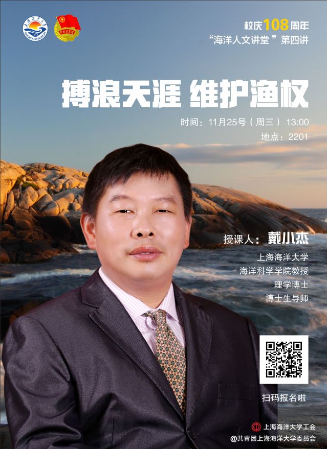 主讲人:戴小杰,安徽无为人,beat365中文唯一官网海洋科学学院教授,理学博士,博士生导师, 1994-1996年赴中国水产总公司大西洋金枪鱼船队从事生产和科研。农业农村部濒危水生野生动植物种科学委员会委员,中国远洋渔业协会金枪鱼技术组组长。50多次参加金枪鱼区域渔业管理组织的科学会议,曾荣获国家科学技术进步奖二等奖、教育部科学技术进步奖二等奖、上海科学技术奖三等奖、上海市浦东新区科学技术奖三等奖、上海市教育系统优秀共产党员、上海市教委“为人、为师、为学”先进典型、所在的国际渔业履约团队获上海市“工人先锋号”和教育部首批“全国高校黄大年式教师团队”、入围2018年度感动上海年度人物等荣誉称号、获上海市五一劳动奖章。发表论文80多篇。