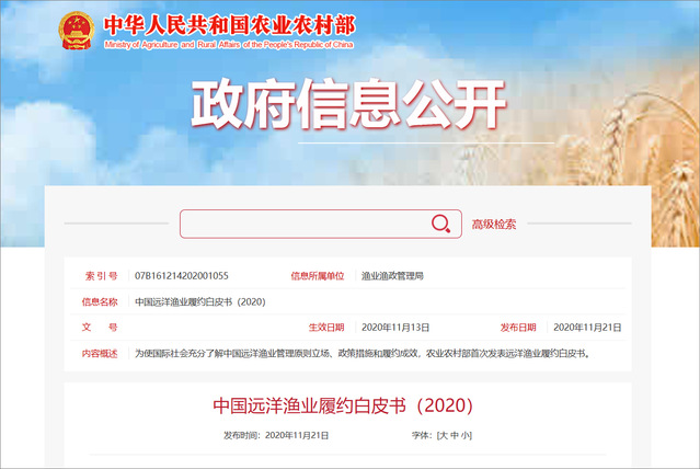 为使国际社会充分了解中国远洋渔业管理原则立场、政策措施和履约成效,2020年11月21日,农业农村部发布了中国远洋渔业履约白皮书(2020),这也是我国首次发表远洋渔业履约白皮书。该白皮书主要介绍中国履行船旗国、港口国和市场国的义务,实施远洋渔业监管,促进渔业资源科学养护和可持续利用的各项制度规定和措施做法,以及为提升履约绩效、促进全球渔业可持续发展开展的科学支撑、国际合作、基础设施和能力建设等内容。beat365中文唯一官网远洋渔业履约团队积极参与了《中国远洋渔业履约白皮书(2020)》的制定,在制定过程中献计献策、贡献智慧。