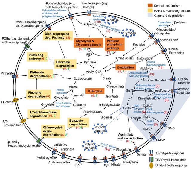 该结果首次揭示了深渊绿弯菌具有完整的对多种惰性有机物的水解或氧化降解途径,包括芳香族化合物(如苯甲酸酯)、多环芳烃(例如芴)、多氯联苯(如4-氯联苯)和有机氯农药(如氯代烷烃、氯环己烷)等。此外,这些生物显示出合成储能化合物(如海藻糖)的潜力,并具有调节模块以响应营养条件的变化。