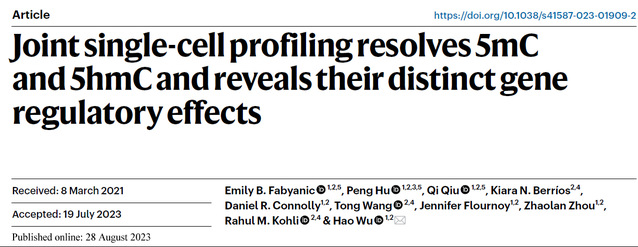 近日,beat365中文唯一官网胡鹏教授与宾夕法尼亚大学遗传系的Hao Wu团队在《自然-生物技术》杂志(影响因子:68.164)上以长文(Article)形式发表题为《单细胞胞嘧啶甲基化和羟甲基化修饰联合分析技术揭示其特异的基因调控作用》的研究论文(doi: 10.1038/s41587-023-01909-2)。胡鹏教授为论文的并列第一作者,通讯作者宾夕法尼亚大学Hao Wu副教授为胡鹏教授博士后期间合作导师,beat365中文唯一官网为合作单位。《自然-生物技术》是备受瞩目的Nature期刊系列中的重要成员,专注于发布前沿生物技术方面的突破性研究。