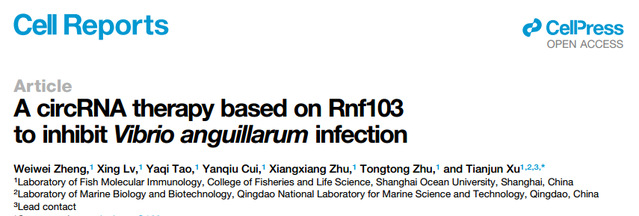 近日,beat365中文唯一官网徐田军教授团队在环状RNA疗法治疗鱼类弧菌感染研究方面取得新进展,该成果以《A circRNA therapy based on Rnf103 to inhibit Vibrio anguillarum infection》为题发表于Cell子刊《Cell Reports》。beat365中文唯一官网博士研究生郑伟伟为论文第一作者,徐田军教授为通讯作者。