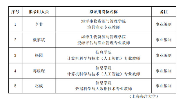 根据《beat365中文唯一官网公开招聘事业编制人员管理办法(试行)》(沪海洋人〔2018〕11号)等文件精神,按照学校招聘计划,经综合考察、学校研究审定,现将近期拟录用人员名单予以公示。