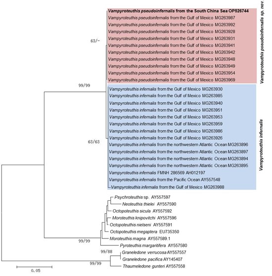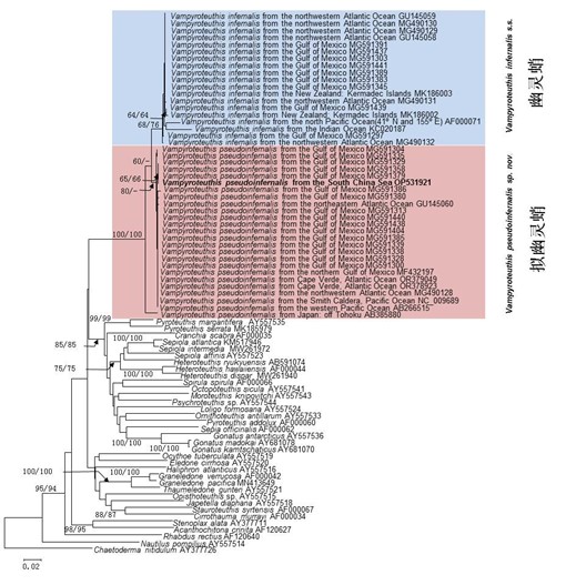 2016年9月,在海南岛东南海区800—1000米水深采集到一个类似幽灵蛸的标本(图1),经过其与幽灵蛸形态比对,发现二者在形态上存在着明显的差异,包括尾部的形态、下角质颚的形状、发光器的位置。同时,线粒体COI基因与核基因28S rDNA系统进化分析中呈现出两个遗传距离较大的分支,且具有较高的支持值(图2,3)。在此基础上,将南海采集的标本形态特征与历史报道的10个同物异名种的形态特征进行了系统的比较分析,确认南海采集到的标本与之前报道的同物异名种有着明显的差异。最终,我们确定采集到的标本为幽灵蛸属一个新物种,成为幽灵蛸目已知的第二个现存物种;并定名为拟幽灵蛸(VampyroteuthispseudoinfernalisQiu, Liu & Huang, sp. nov.)。