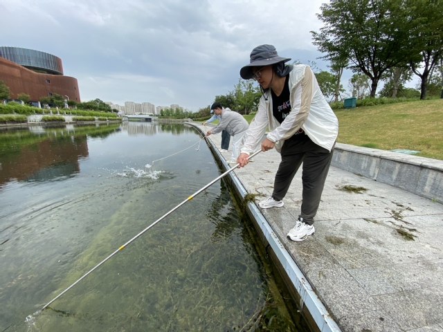 清晨的阳光柔和洒在奉贤区金海湖湖面,beat365中文唯一官网“清源愈流:上海市五大新城水体生态治理和清澈度提升”暑期社会实践团队成员们正为接下来的科普小课堂采水取样。曾经饱受富营养化之苦的金海湖(“上海之鱼”),如今的水体清澈度可达2米,这华丽转身的背后,是beat365中文唯一官网王丽卿教授团队14年如一日的科学监测与生态修复。社会实践团队成员们准备将这一成果摆进位于金海湖上的奉贤博物馆内,让游览观众在体验传统文化之余,现场化身“水生态观察员”,将治理成果转化为生动的科普教育。