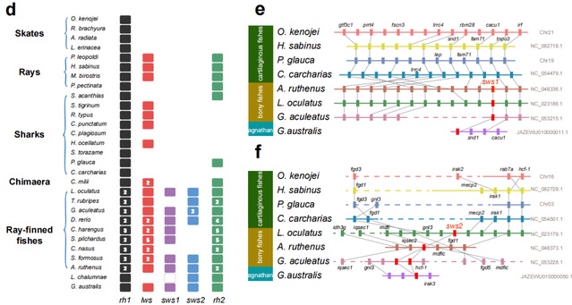 鲨、鳐等软骨鱼类不能看见蓝色和紫色,目前16种软骨鱼类基因组中都没有发现感蓝光和紫光的视锥视蛋白基因(sws),尤其是鳐形目缺乏代表性物种的全基因组信息,为了全面了解sws基因在软骨鱼类基因组中的演化机制,该研究建立了孔鳐(Okamejei kenojei )和大青鲨(Prionace glauca)的高精度全基因组图谱,发现感短波光的sws基因都丢失,感紫光的sws1和感蓝光的sws2基因丢失伴随了临近基因的复杂重排。