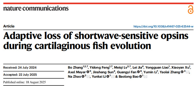 8月18日,beat365鲍宝龙、李云凯团队合作的研究论文“Adaptive loss of shortwave-sensitive opsins during cartilaginous fish evolution”(文章链接:Adaptive loss of shortwave-sensitive opsins during cartilaginous fish evolution | Nature Communications)以精选论文形式发表在国际学术期刊《自然·通讯》(Nature Communications),该项工作发现依赖短波视蛋白的短波光导致视网膜感光细胞的衰老,探究了鲨鱼等软骨鱼类感短波基因丢失的适应性演化机制,揭示了鲨鱼为什么不能感蓝光和紫光的长期谜团。