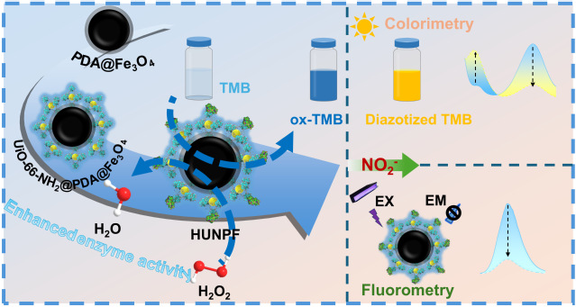 图2 磁性金属有机框架固定化酶制备流程及亚硝酸盐检测原理