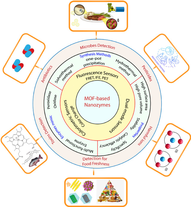 在纳米酶领域,团队成员Bakhtawar Shafiqu 2025年6月在《Food Control》(中科院1区Top,JCRQ1,IF:6.3)发表综述,系统评述了金属/配体调控MOF纳米酶形貌与性能机制,阐明了其荧光/比色传感原理,并重点展示在食品化学危害、物理危害及微生物污染快速检测中的应用(图3)。