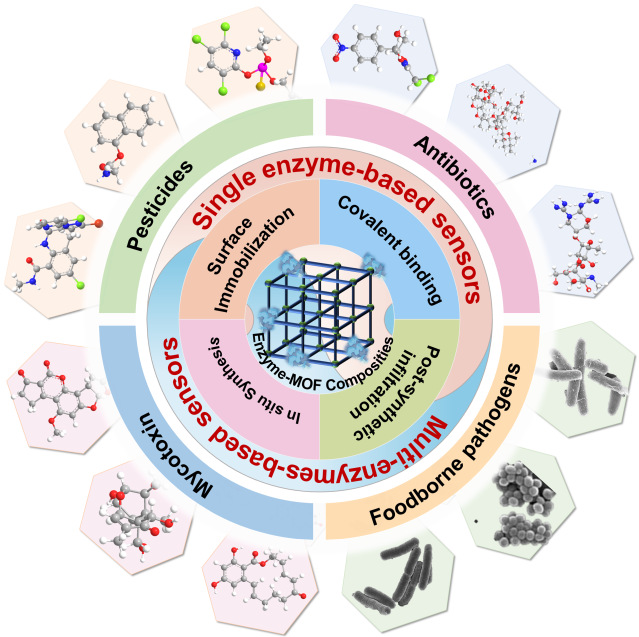 在金属有机框架固定化酶领域,团队成员付祖耀2025年9月在《Coordination Chemistry Reviews》(中科院1区Top,JCRQ1,IF:23.5)发表综述,系统评述了MOF固定化酶技术的研究进展,重点阐述了固定化酶传感器的设计原理、优化策略及其在农药残留、抗生素、食源性病原体及真菌毒素检测中的应用(图1)。