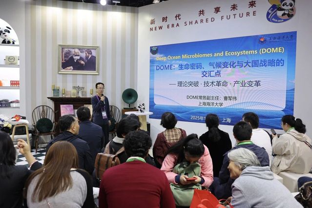 11月8日,在进博党群服务站内,联合国“海洋十年”大科学计划“深海微生物组与生态系统”(Deep Ocean Microbiomes and Ecosystems, DOME)办公室常务副主任曹军伟,面向所有进博观众,阐释了深海微生物的无限可能。