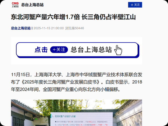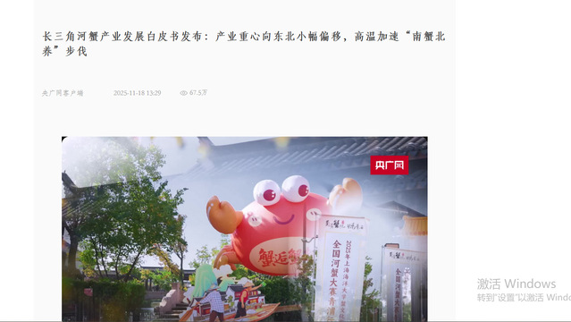 央视新闻以《东北河蟹产量六年增1.7倍 长三角仍占半壁江山》为题,报道了河蟹大赛情况。