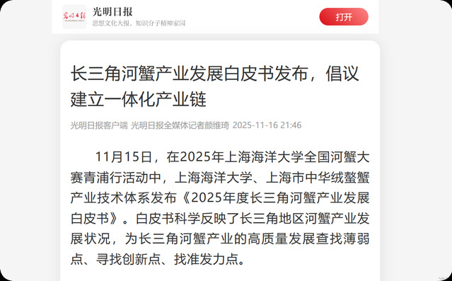 长三角河蟹产业发展白皮书发布,倡议建立一体化产业链》的稿件。
