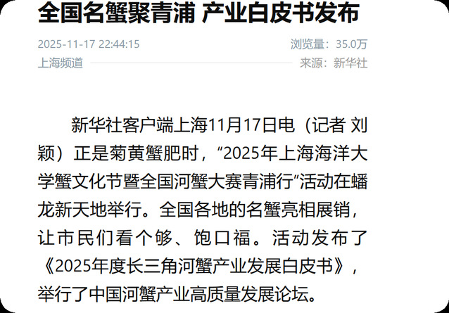 新华社上海频道以《全国名蟹聚青浦 产业白皮书发布》为题,报道了白皮书、中国河蟹产业高质量发展论坛等盛况。