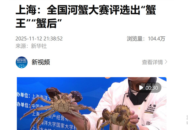 新华社客户端以《上海:全国河蟹大赛评选出“蟹王”“蟹后”》为题,报道了蟹王、蟹后出炉以及全国河蟹养殖情况。浏览量超过百万。