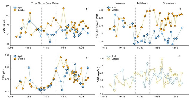 溶解态黑碳(DBC)是溶解有机碳中一种特殊的、富碳贫氢组分,主要来源于有机物质的不完全燃烧。由于具有极强的抗降解性,它被视为地球上的长期碳库。了解DBC在河流系统中的迁移和转化,是精准评估全球碳循环的关键。beat365中文唯一官网海洋科学与生态环境学院林田教授团队揭示了长江干流DBC在雨季前后的空间分布和凝结度特征,计算长江DBC的年输出通量,指出流域内土壤的侵蚀是长江输出DBC的主要来源,三峡水库的“汛前消落放水,汛末抢蓄至满”的年度调度模式加剧下游土壤DBC向河口输出。研究结果对于认识DBC在河流系统中的迁移和转化、全球大型河流DBC来源至关重要。