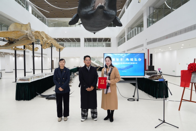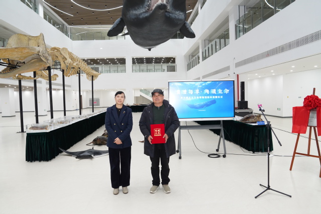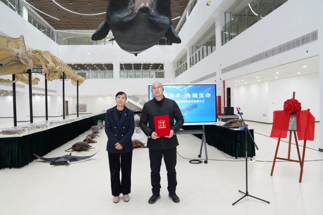 校党委副书记、校长胡炜(右)与校党委副书记、副校长夏雅敏(左)为抹香鲸标本档案揭幕