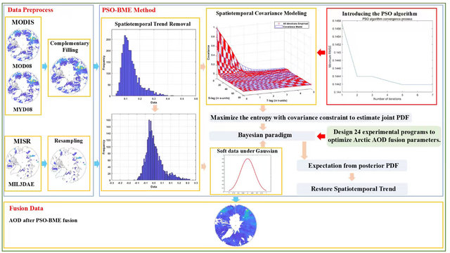 图1. 基于PSO-BME方法的多源卫星AOD产品融合框架示意图