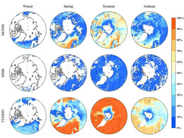 图 2. 2008-2022年北极原始MODIS/MISR产品,以及融合后AOD产品的有效覆盖率