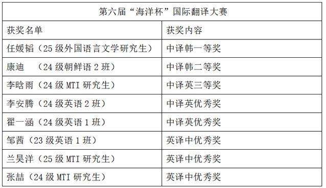 “海洋杯”国际翻译大赛是在全国翻译专业学位研究生教育指导委员会、中国翻译协会指导下,由涉海高校联合主办的全国性赛事。本届大赛吸引全国208家院校及企事业单位的2126名选手参赛。获奖者涵盖上海海事大学、吉林外国语大学、延边大学、中国海洋大学、对外经济贸易大学等多所知名高校。beat365学子能在如此高水平赛事中脱颖而出,有力印证了学校外语学科建设的深厚功底与人才培养模式的创新成效。
