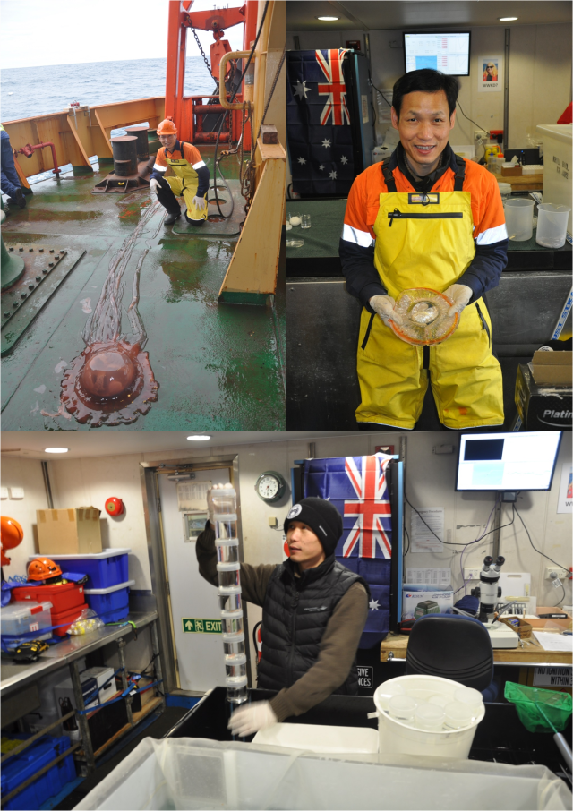 Zhu in Investigation (upper: Jelly Fish of the Antarctic; Lower: Observing shelling of euphausia superba)