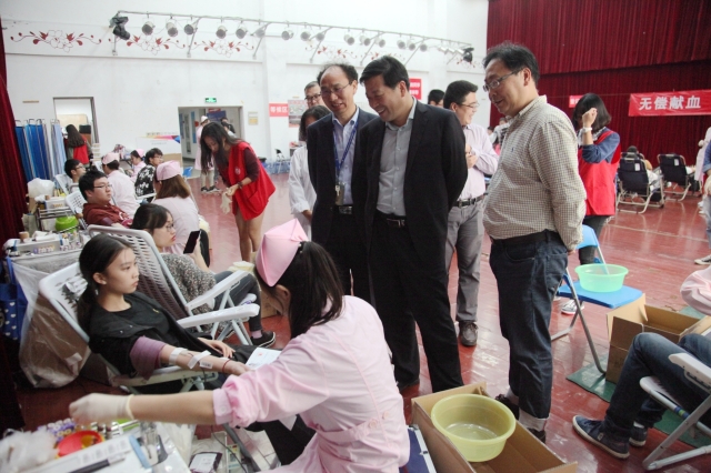 Wu Jiamin, Secretary of SHOU CPC Committee, extending his regards to faculties and students donating blood