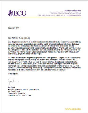 Professor Jon Rezek, Assistant Vice President in charge of international affairs of East Carolina University has sent a consolation letter, and expressed his concerns for the spread of the coronavirus in Hubei Province of China and in other regions across the globe over the past months. He has also expressed his strong belief in China’s ability to return to normal, as China is a country full of energy and resilience and the Chinese people are known for their diligence and wisdom.