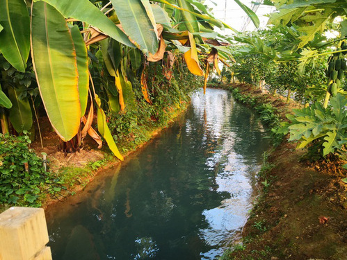 In Taiheyuan Pastoral Complex Demonstration Area, there are colorful Lycium barbarum and Dendrobium nobile, swaying Rosmarinus officinalis and Cymbopogon citratus, and fruitful papaya, Passiflora edulis Sims, litchi, and longan on the land; in the water, Polyodonspathala, Golden Trout, Langoustine, and Chinese mitten crabs swim around freely. All these combine to manifest a luxuriantly green and vigorously thriving pastoral landscape.