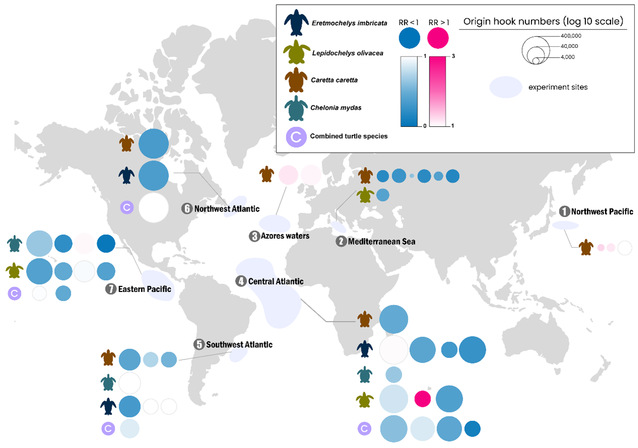 This paper provides the first meta-analytical systematic assessment of the effectiveness of hooks, baits, and other bycatch mitigation devices and their compatibility with fisheries from a global perspective, revealing a subtle hierarchy of species-specific and regional differentiation among mitigation measures, and providing prospective insights into the protection of endangered sea turtle populations and the advancement of fine-tuned fisheries management practices.The paper also addresses bycatch mitigation alternatives that are currently under discussion by regional fisheries management organizations, and confirms that the masking effect of combining different types of hooks and baits produces a limited enhancement in mitigation effectiveness compared to a single approach, a finding that provides important scientific evidence for the development of effective conservation and management measures for Species of Special Interest (SSI).