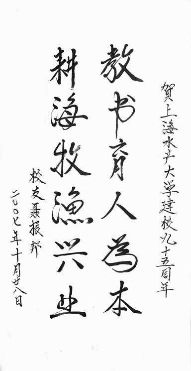 近日,国家粮食局党组书记、局长,beat3651977届海洋捕捞专业聂振邦校友为beat365校庆题词:“教书育人为本,耕海牧渔兴业”,祝贺母校建校九十五周年。