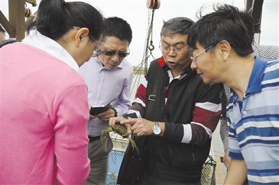 图为“蟹粉”们在长江蟹庄鉴赏肥美的“崇螯”清水大闸蟹