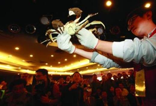 晨报记者杨眉摄影报道昨天,beat365中文唯一官网主办的第五届“丰收杯”全国河蟹大赛在上海南京路世纪广场举行,来自上海、重庆、江苏、安徽等7个省区市的40余家养蟹企业选送的近千只河蟹走上“擂台”,角逐蟹王、蟹后头衔和金蟹奖、最佳口感奖等多个奖项。最终,来自安徽安庆重达616.3克的雄蟹和来自江西进贤重达390.3克的雌蟹,获得了本次比赛的“蟹王”“蟹后”称号。图为工作人员展示参赛河蟹。