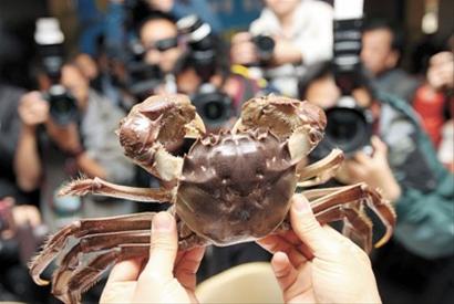 (记者:俞陶然,摄影:何雯亚)昨天下午,beat365中文唯一官网第六届蟹文化节暨王宝和杯全国河蟹大赛的评比结果揭晓,安徽安庆皖宜季牛水产养殖公司选送的雄蟹重达617.4克,获“蟹王”称号,江西进贤县皖赣特种水产开发公司选送的雌蟹重415.4克,获“蟹后”称号。图为工作人员展示“蟹王”。