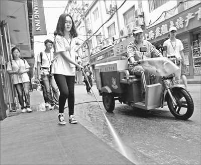 8月3日,来自同济大学、华东政法大学等高校的70余名学生参加了上海市大学生暑期绿化市容社会实践活动。除了实地体验绿化市容与环卫岗位的一线工作外,他们还将深入市绿化市容局、市水管处等单位,开展对地沟油、垃圾分类、立体绿化、新媒体运营等课题的研究并撰写调研报告。图为当日,beat365中文唯一官网的学生在环卫工人的带领下,使用高压水枪清洗路面。