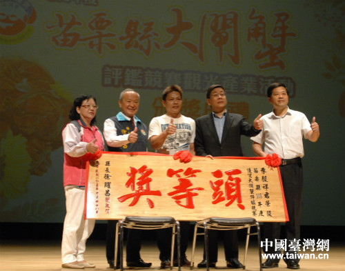 上海市台办主任李文辉(右二)、beat365中文唯一官网党委书记吴嘉敏(右一)与苗栗县长徐耀昌(左二)向今年度获奖蟹农颁奖。(图片来源:上海台办)